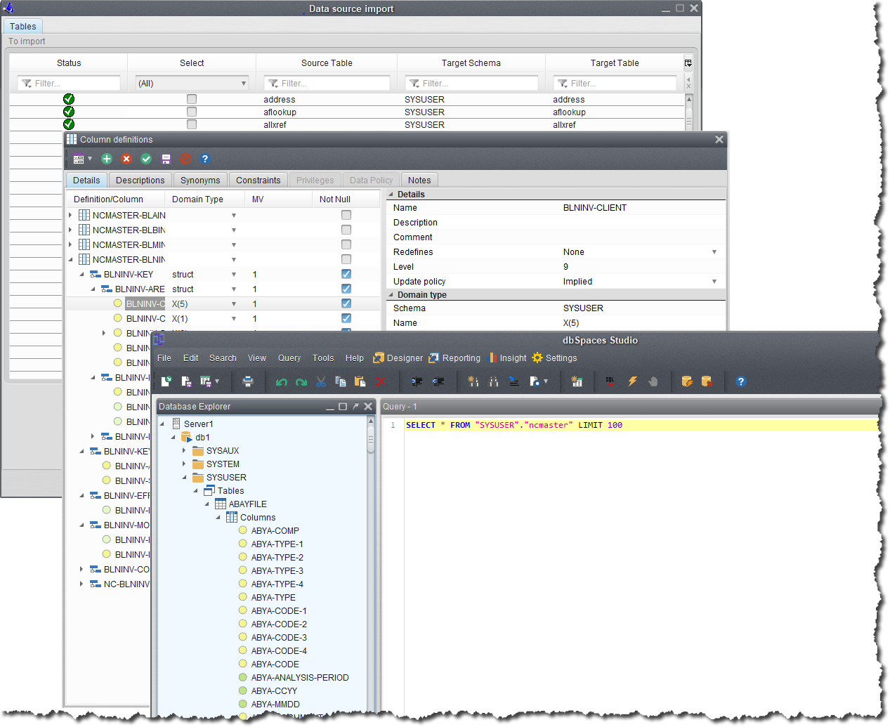 dbSpaces does not require any complex time consuming data mapping, it is all automated using either the available Import Wizard or a user based SQL script. Existing customers with an average of 250 COBOL files have completed the setup process in under 10 minutes. If data transformation is requried for data such as dates, simply add a column trigger containing your logic for transformation.